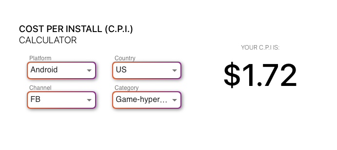 If you have an app and try to do paid marketing campaigns, you probably have no idea if your Cost Per Install (CPI) is good, decent or terrible. This Cost Per Install calculator shows you the benchmark for good CPI based on your app category (Finance, game, business...), target country (US, UK, Germany....), platform (iOS or Android) and channel (Facebook, Instagram, TikTok, Twitter....). Based on the latest data from top sources. Save thousands of dollars and hundreds of hours of Googling trying to guess what your CPI should be. Instead, get this calculator and know for sure if your numbers are good or need improvement. We have 1.436 data points from 13 qualified sources that are kept up to date and we’re adding more! This product comes with a 30-day money-back guarantee. If you’re not happy, just email me at hello@dariusmora.com and I’ll give you the money back, no questions.
